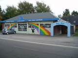 Parkplätze befinden sich vor dem bunten Gebäude. Der ursprüngliche Zweck ist noch zu erkennen.