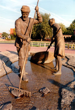 Die Figuren zeigen, wie früher von Land aus gefischt wurde. Jan sticht Plattfische, während Gret Krebse, Muscheln und Aale einsammelt.