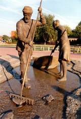 Jan sticht mit der "Prigg“(Gabel) und Gret fängt mit der "Gliep“ (Schiebenetz). Die bronzene Figurengruppe wurde 1997 von dem deutschen Bildhauer Claus Homfeld geschaffen und von den Sankt Peteranern gestiftet.