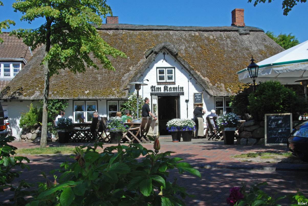 Die Dorfstraße, die früher nur „DE STRAAT“ hieß, hat nur Reetdachhäuser und führt bis an den Deich